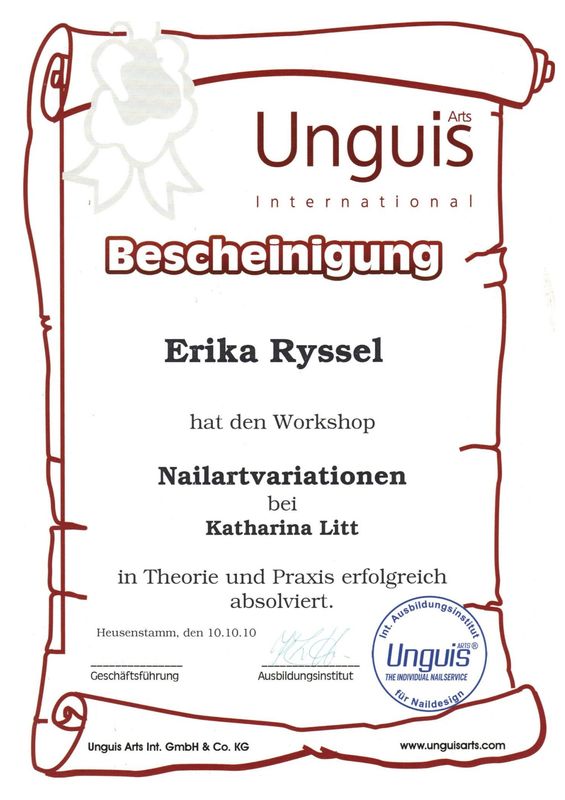 Um meinen Kundinnen in den Bereichen Nail-Design, Wimpernverlängerung und Bodystyling immer die neuesten Techniken und Trends in meinem Studio bieten zu können, bilde ich mich in anerkannten Institutionen weiter.